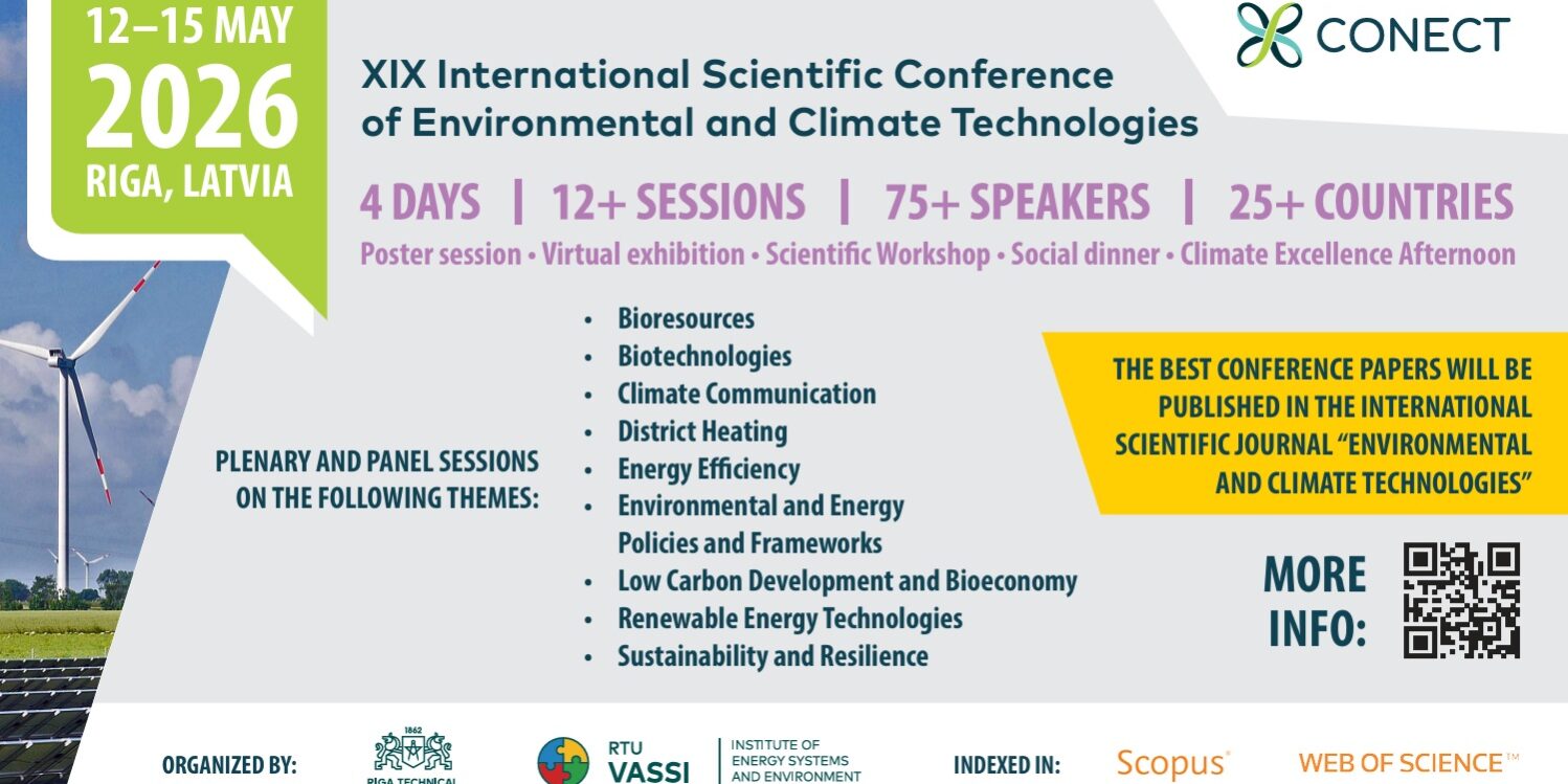 CONECT 2026 is an international scientific conference on environmental and climate technologies, held annually since 2008. The conference will take place on 12–15 May 2026 at Riga Technical University, Zunda Krastmala 8, Riga, Latvia.
